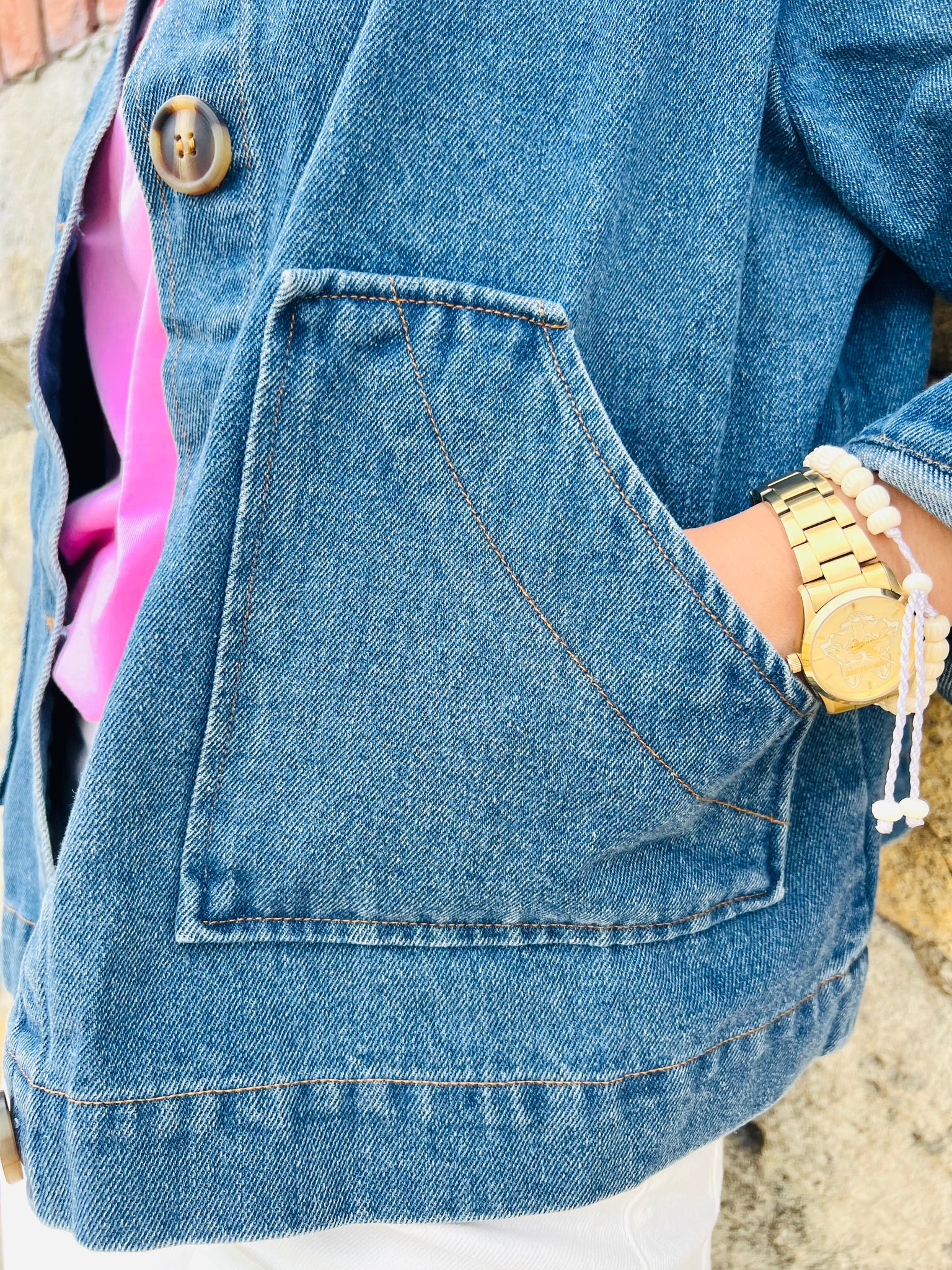 🌿 Marine d’Ancre – Veste en Jean Brut à Boutons Contrastés